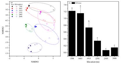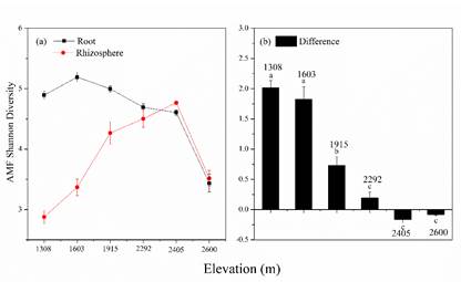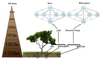 图1 根际和根部丛枝菌根的沿海拔差异性