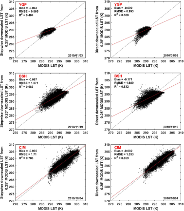 图4 三个实验区原始MODIS LST与逐级和直接降尺度后LST的散点图。黑色虚线为1:1线,红色直线是散点的趋势线。