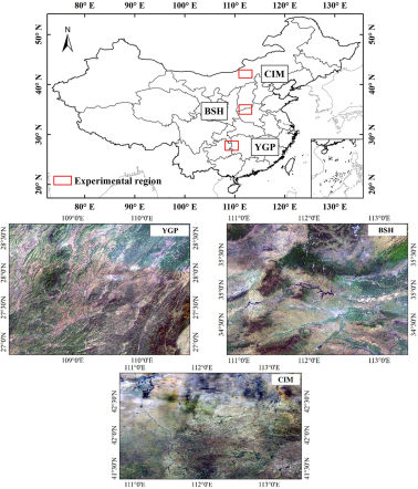 图1 研究区概况,包括YGP(云贵高原东部),BSH(晋南豫西边界)和CIM(内蒙古中部)三个不同地形、植被、气候类型分区。