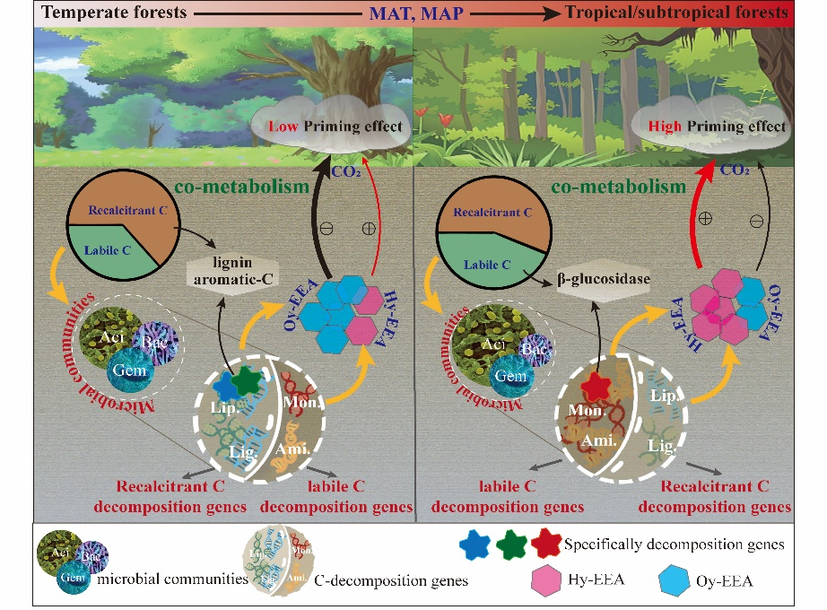 土壤激发效应是与碳循环相关的最复杂、最不为人知的过程之一。土壤激发是一个微生物驱动的过程,它决定了土壤-气候反馈对新鲜碳输入的响应。尽管它很重要,但该过程背后的微生物特征在很大程度上尚未确定。基于此,本研究沿3425 km的中国东部南北样带10个森林土壤开展大尺度取样,覆盖寒温带、暖温带、亚热带和热带地区,使用13C-葡萄糖和宏基因组测序方法,以揭示土壤有机碳激发效应及微生物驱动机制。研究结果表明,土壤微生物碳分解基因是调控热带到寒冷地区土壤碳激发效应降低的关键因素,其作用超过了传统的植被、土壤和气候属性。并且在温带森林中,参与木质素和芳香等化合物降解的基因与有机碳激发呈负相关关系,而在热带/亚热带森林中,活性碳分解基因特别是编码β-葡萄糖苷酶的基因与激发呈正相关关系。在基因筛选基础上,首次重建了与有机碳激发相关的42基因集,并分选了部分参与碳分解的新物种。研究工作强调了微生物性状在解释森林生物群落土壤激发效应中的重要性,并表明快速碳代谢是森林激发效应的原因。相关结果为模型预测全球变化背景下土壤碳库的动态变化提供了重要科技支撑。