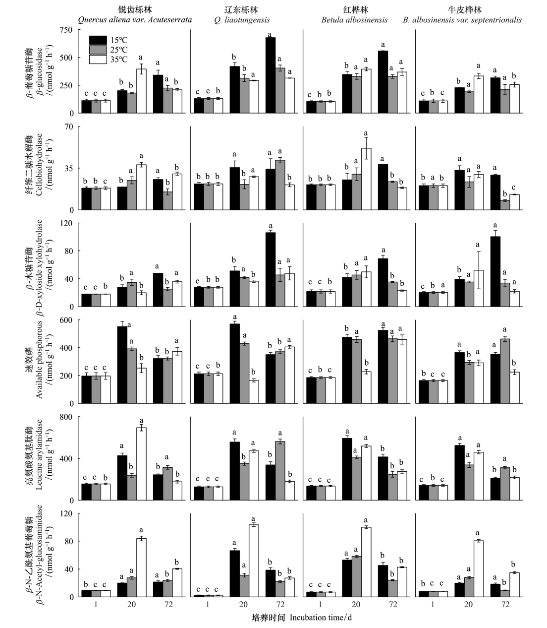 图7 不同培养阶段中不同林带的土壤中的胞外酶活性