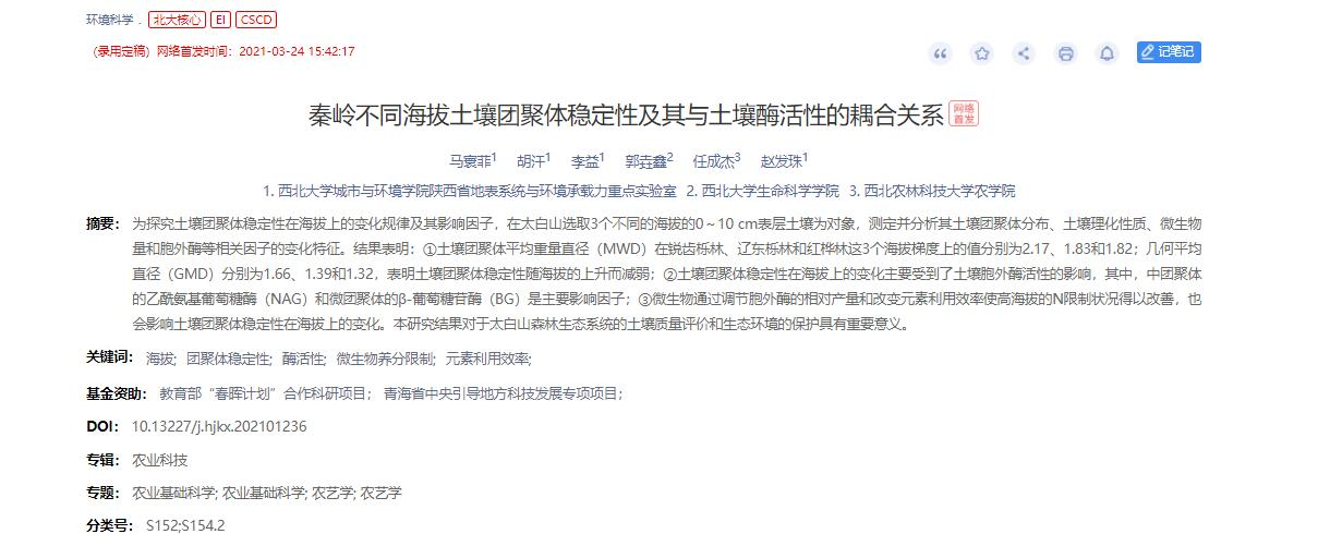 【论文题目】秦岭不同海拔土壤团聚体稳定性及其与土壤酶活性的耦合关系