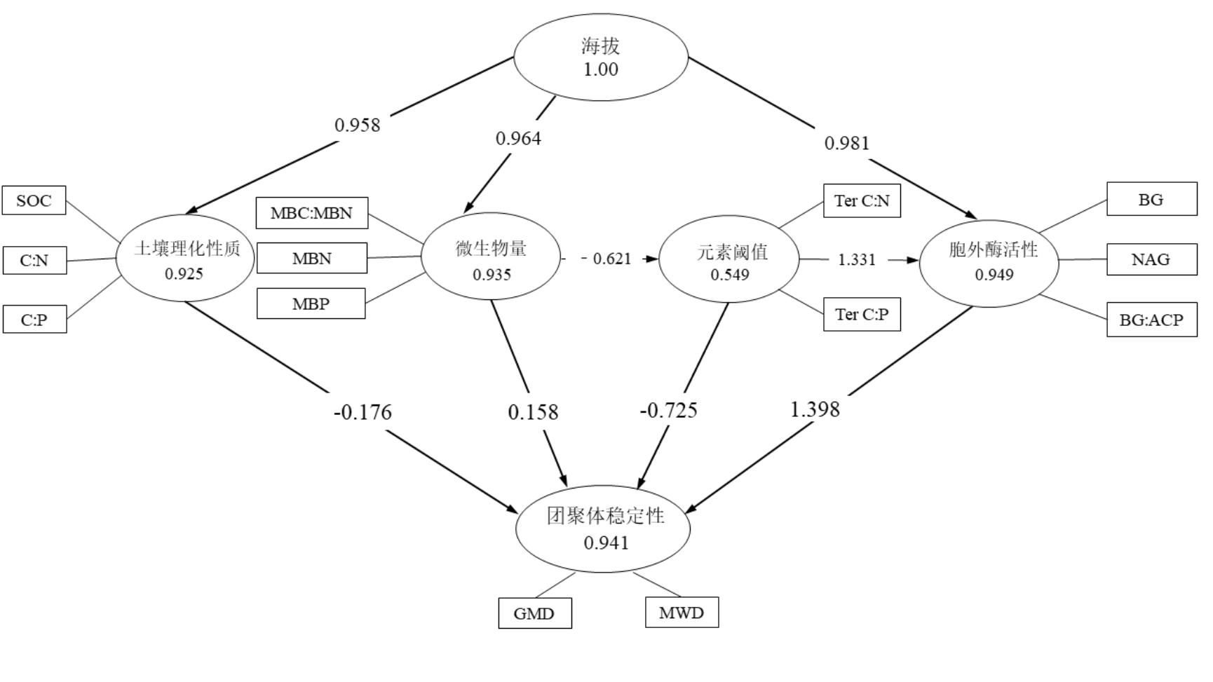 图6 土壤团聚体稳定性驱动因素的偏最小二乘路径模型