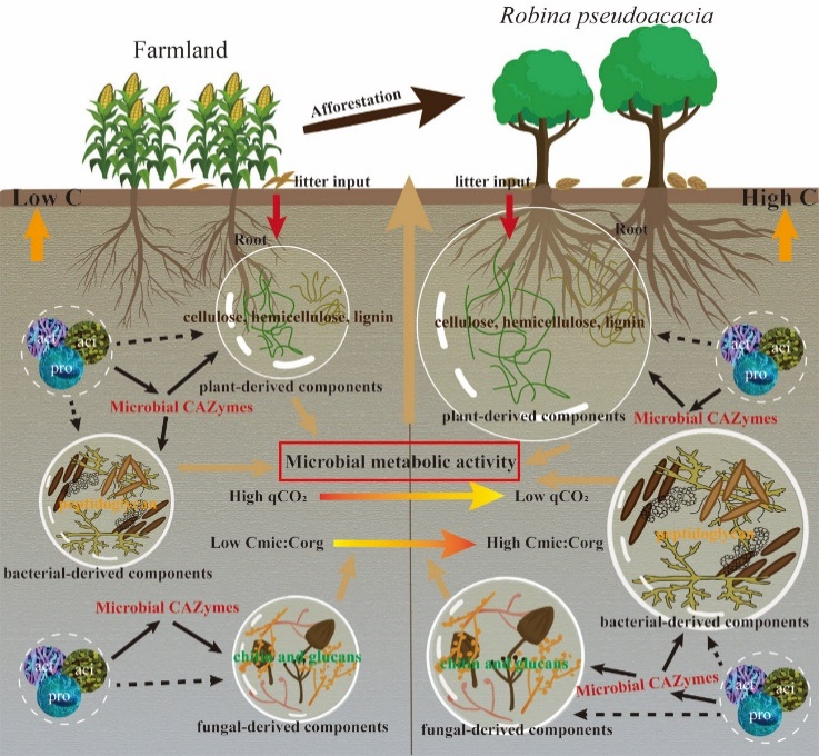 研究对地处中国黄土高原的陕西省延安市安塞区五里湾地区连续45年的植树造林地进行了定点研究。结果表明,在造林后,降解植物和微生物来源碳的土壤微生物CAZyme家族显著增加,特别是在20年处出现显著峰值。其中,优势菌门(如放线菌门,变形菌门和酸杆菌门)通过相应的CAZyme家族从植物和微生物生物量成分中分解碳源。此外,参与植物源组分(如纤维素,半纤维素和木质素)分解的CAZymes的丰度增加有助于碳库的形成。就微生物来源碳组分而言,编码细菌来源碳(几丁质)的CAZymes的丰度大于编码的真菌真菌来源碳(几丁质、葡聚糖)的CAZymes的丰度,并且与微生物代谢活性(qCO2与Cmic:Corg的比例)更相关,研究证实了植树恢复过程中土壤细菌死亡残体对土壤碳周转的重要性。