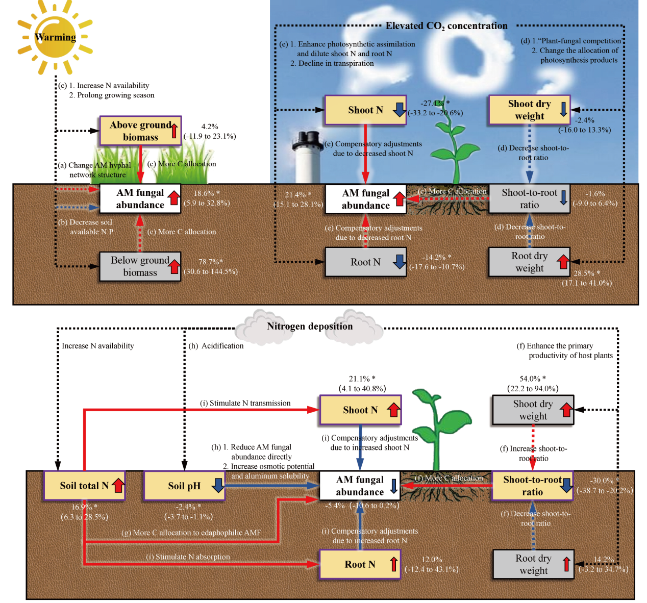 丛枝菌根真菌(AMF)在碳循环中起着关键作用,对气候变化非常敏感。然而,AM真菌丰度对气候变化的响应尚不清楚。基于此,本研究采用Meta分析,研究了全球尺度的AM真菌丰度对气候变暖、CO2浓度升高(eCO2)和N添加的响应模式。结果表明,在全球范围内,增温和eCO2均显著增加AM真菌数量,分别为18.6%(95% CI: 5.9%-32.8%)和21.4%(15.1%-28.1%)。然而,AM真菌丰度的响应比(RR)随升温程度的增加而降低,但是随eCO2升高而升高。在增温试验中,只要增温超过4℃,无论试验持续时间、方法、周期和生态系统类型,增温对AM真菌丰度的影响均由正转变为负。施氮对AM真菌丰度的影响为-5.4%(-10.6%-0.2%),且与氮肥投入量和生态系统类型有关。草地和农田在施氮量分别超过33.85和67.64 kg N hm-1 y-1时,AM真菌丰度RR均为负;但只有当施氮量超过871.31 kg N hm-1 yr-1时,氮添加才会降低森林中AM真菌丰度。研究结果为预测全球变化下AM真菌丰度的生态功能提供了理论依据。