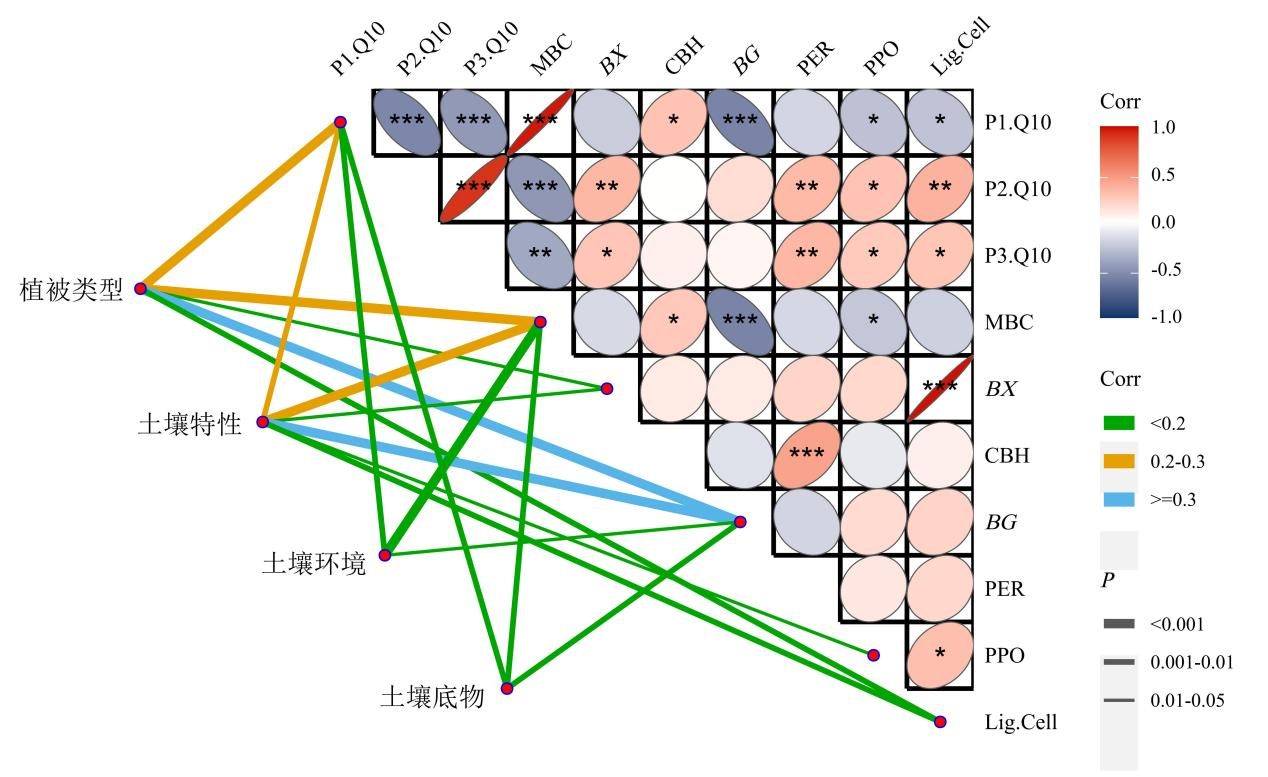 图5 各碳库Q10与胞外酶的相关性分析及环境因子Mantel分析