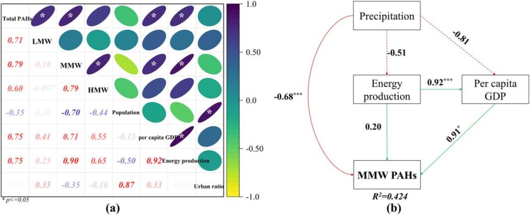 图4 PAHs组成特征与人为因素之间的相关系数(a);显示气候和人为参数对中量程PAHs的直接和间接影响的结构方程模型(b)。