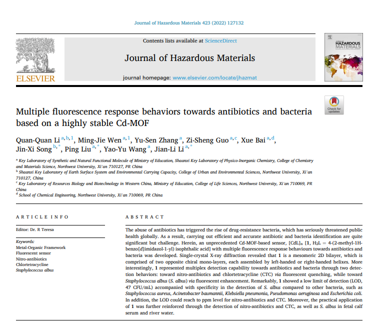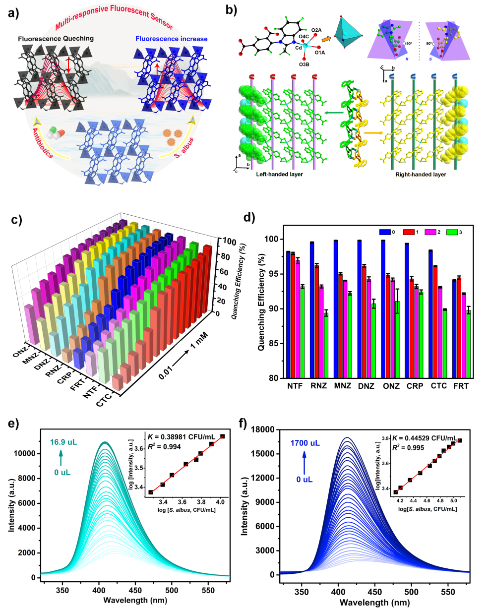 近年来,抗生素及其滥用致使多重耐药菌发展日益壮大,严重危害了人类的生命健康和生存环境。快速有效地区分检测抗生素和细菌对指导抗生素使用至关重要。然而,目前大多数抗生素或细菌荧光传感器属于“turn-off”或“turn-on”型,因其类似的荧光淬灭或增强行为,难以区分检测抗生素和细菌。近期,公司宋进喜教授团队的李全全等人开发了一例高稳定新型多功能二维Cd-MOF荧光传感器:一方面可通过荧光淬灭行为检测硝基类抗生素和金霉素,另一方面可通过荧光增强行为检测白色葡萄球菌。值得注意的是,与金黄色葡萄球菌、鲍曼不动杆菌、肺炎克雷伯菌、铜绿假单胞菌和大肠杆菌相比,Cd-MOF对白色葡萄球菌的检测具有专一性,且检测限较低(LOD约为47 CFU/mL)。此外,Cd-MOF可作为优异的荧光传感器检测胎牛血清与河水中的硝基类抗生素、金霉素及白色葡萄球菌。据我们所知,这是第一例对抗生素和细菌具有不同荧光响应行为的Cd-MOF传感器,可为实际生活中开发具有区分检测抗生素与白色葡萄球菌的MOFs材料提供依据。