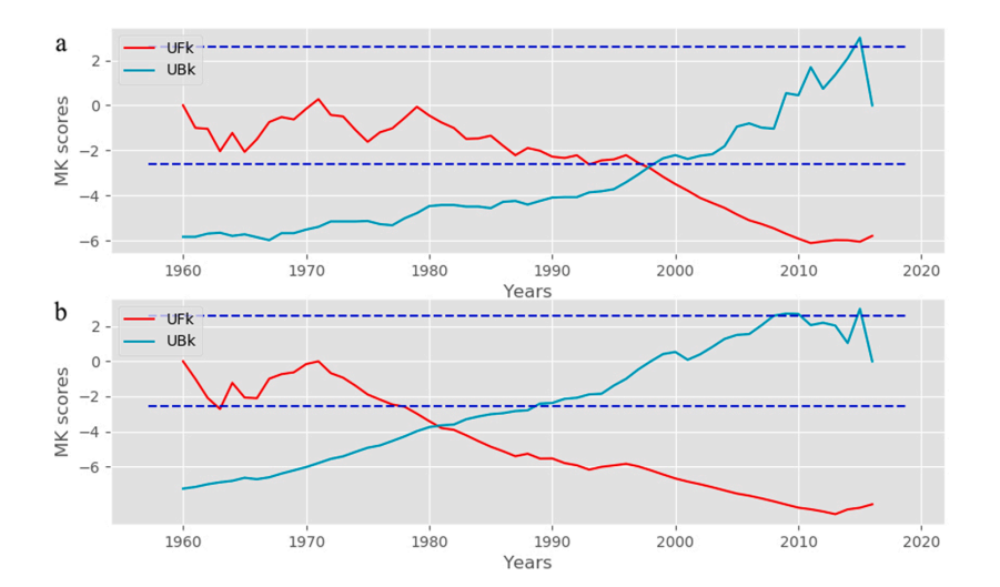 (a) 窟野河流域,(b) 秃尾河流域(虚线代表1%的显着性水平)。