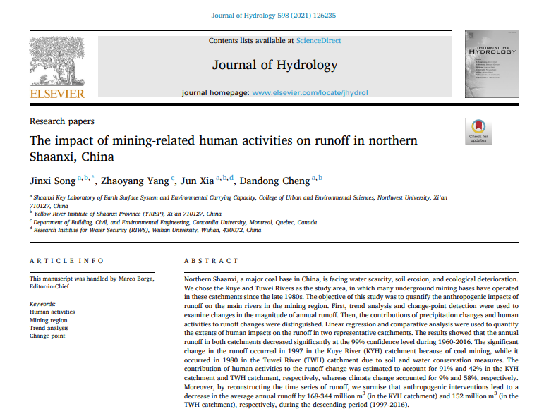 【论文题目】The impact of mining-related human activities on runoff in northern Shaanxi, China
