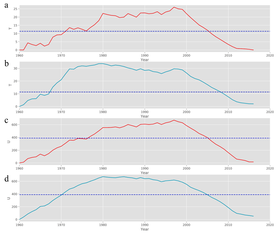 图2 采用SNHT方法检测年均径流突变时间点 (a) 窟野河流域,(b) 秃尾河流域;采用Pettitt 测试法检测年均径流变点 (c) 窟野河流域,(d) 秃尾河流域
