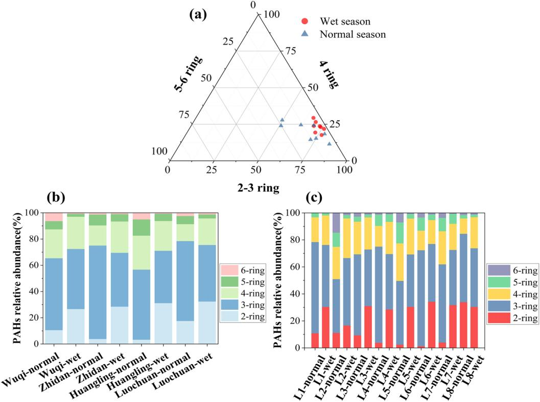 图3 北洛河沉积物中多环芳烃的组成模式,按环径大小划分。(a) 不同的采样活动中,河流沉积物中PAHs成分的三元图。(b-c) 不同采样区和采样点之间PAH成分的季节性和空间性变化。