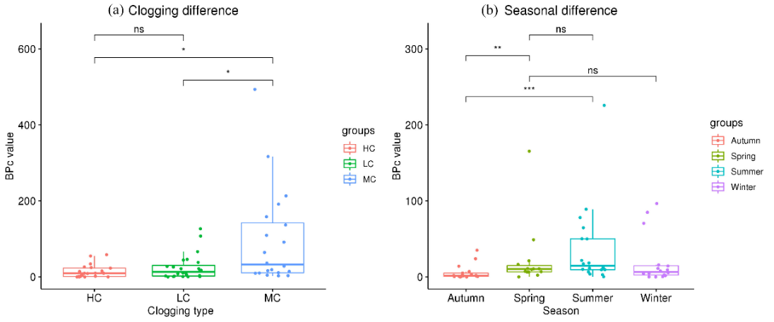 图10 不同淤塞河段及季节Bpc值的差异(a)不同淤塞河段差异(b)不同季节差异。