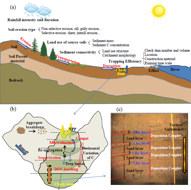 图 6 流域内的土壤侵蚀、运输和沉积过程(a);淤地坝沉积泥沙碳循环过程的关键机制(b); 淤地坝沉积旋回的剖面分布(来自Wang et al.(2017c))(c)