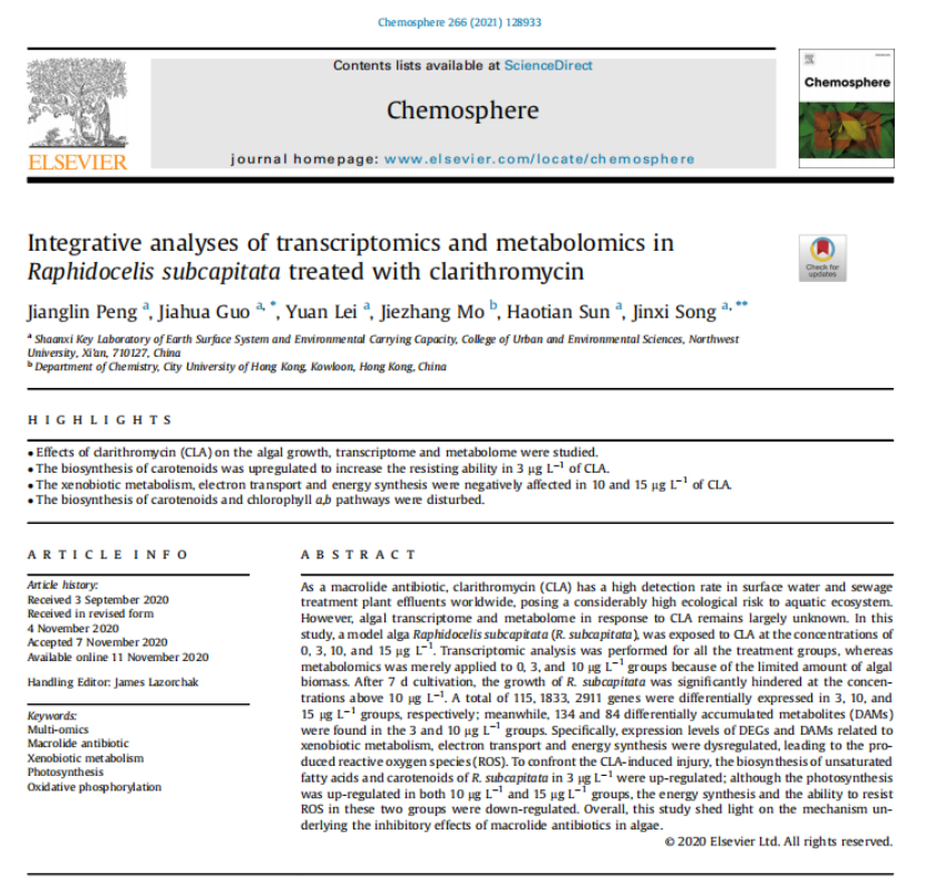 【论文题目】 Integrative analyses of transcriptomics and metabolomics in Raphidocelis subcapitata treated with clarithromycin