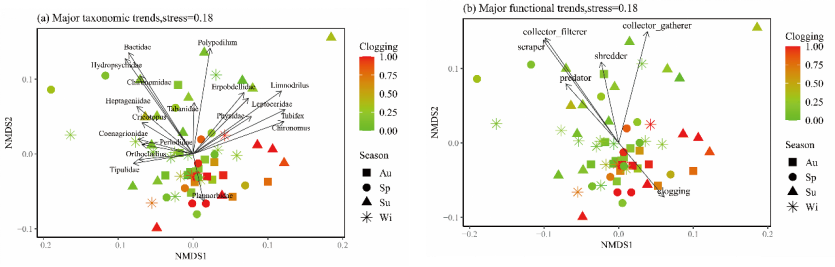 图9渭河细沉积物对潜流带大型无脊椎动物群落结构的季节性影响。(a)分类群分布趋势。(b)摄食类型分布趋势。