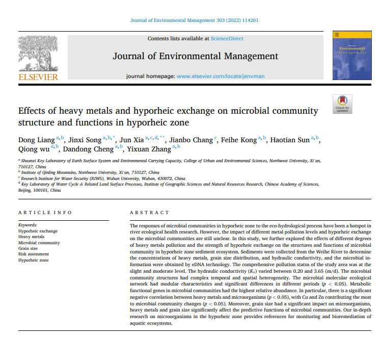 【论文题目】Effects of heavy metals and hyporheic exchange on microbial community structure and functions in hyporheic zone