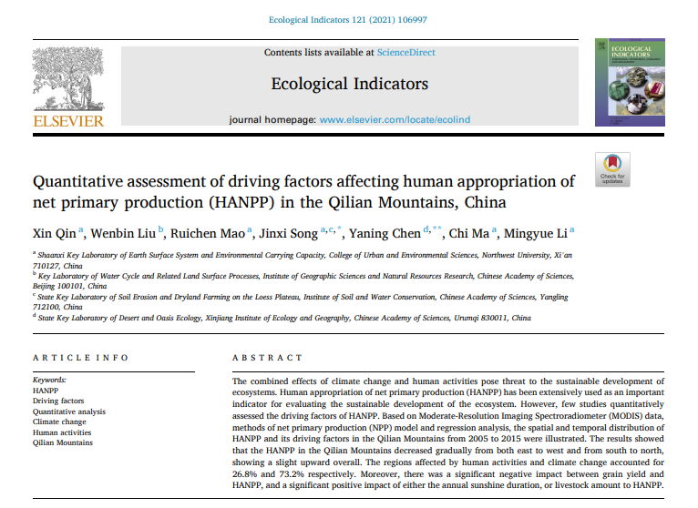 【论文题目】Quantitative assessment of driving factors affecting human appropriation of net primary production (HANPP) in the Qilian Mountains, China
