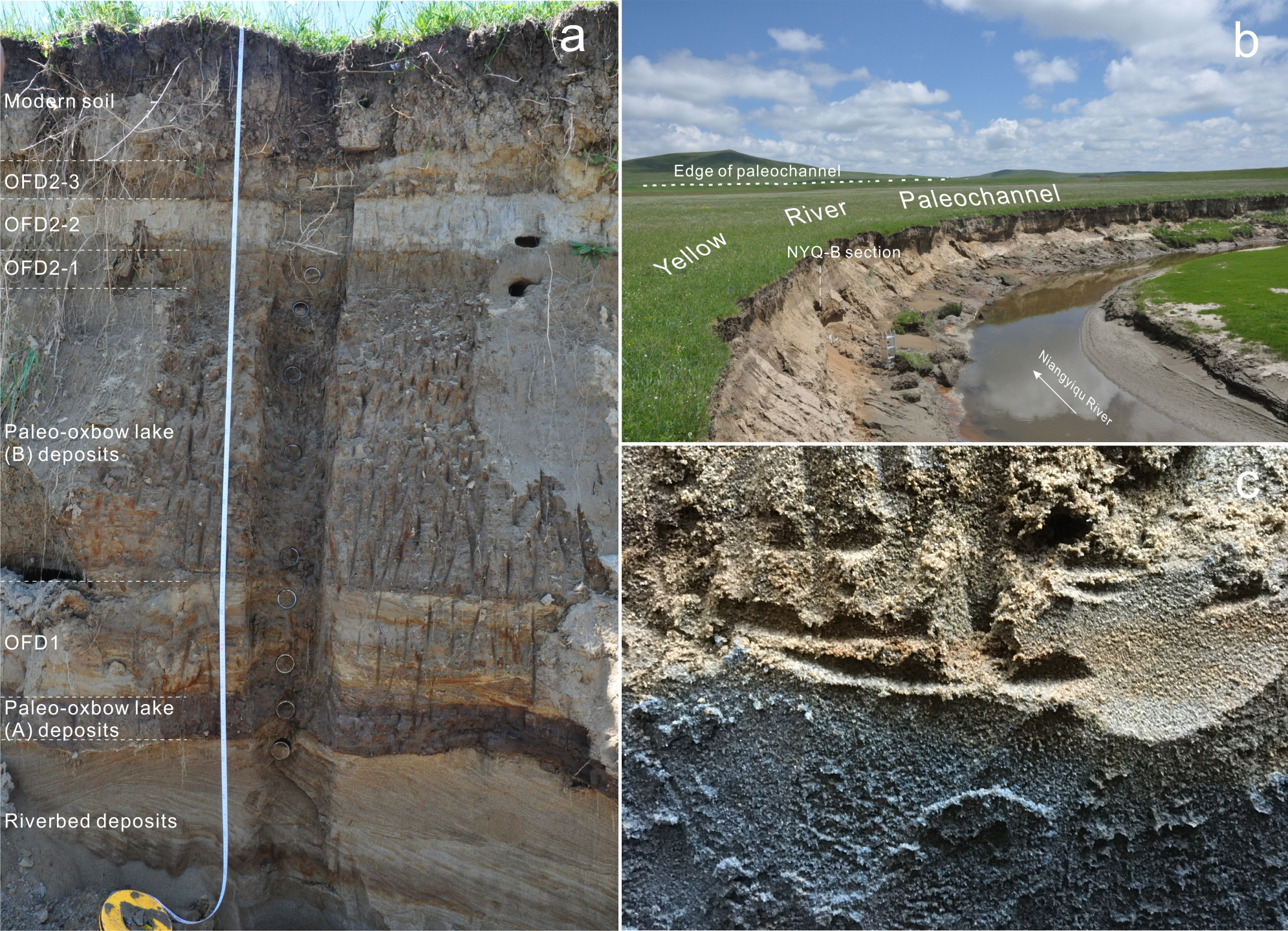 张玉柱副教授团队通过对黄河源若尔盖盆地河段开展广泛细致的野外考察,选择具有代表性的牛轭湖古河道沉积剖面 (NYQ-B) 进行系统采样。基于野外宏观特征和室内磁化率、粒度、烧失量等指标分析结果,准确鉴别出了若尔盖盆地黄河牛轭湖古河道沉积序列中赋存的古河床相沙层、古牛轭湖相沉积层以及古洪水泛滥沉积层等不同成因类型的沉积层,进而建立了其地层沉积序列。结合光释光(OSL)和AMS 14C测年结果,对该牛轭湖古河道沉积序列记录的环境演变信息进行了深入探究。研究结果表明:(1) 剖面记录了4.17±0.49 ka以来牛轭湖古河道的环境变化:在4.17±0.49 ka~3.24±0.26 ka期间,古黄河曾一度占据河道; 3.24±0.26 ka前后古黄河发生裁弯取直(颈口裁弯),古河道则被逐步废弃,河流环境开始向古牛轭湖环境转变;2.45±0.11 ka后古牛轭湖逐步走向消亡;1.31±0.05 ka以来该地开始发育亚高山草甸土,暗示牛轭湖古河道最终向草原景观演变;(2) 古环境代用指标表明,若尔盖地区在约3.00 ka之前气候较为温湿,而在约3.00 ka之后气候开始向干冷转变,这可能主要与东亚夏季风的衰弱和西风环流的增强有关;(3) 2期大洪水事件分别发生在2.92±0.22~2.87±0.27 ka和1.80±0.13~1.70±0.16 ka,在时间坐标上分别对应于全新世中期大暖期向晚期干旱时期的转折阶段以及黑暗时代冷期 (DACP)。这些特征时段由于气候相对寒冷干燥,青藏高原山地冰川普遍推进,冰雪融水的贡献可能较为有限,而气候转折和突变时期大气环流异常停滞、中低纬系统之间相互作用所引发的暴雨洪水,可能是导致这2期大洪水事件的主要原因。