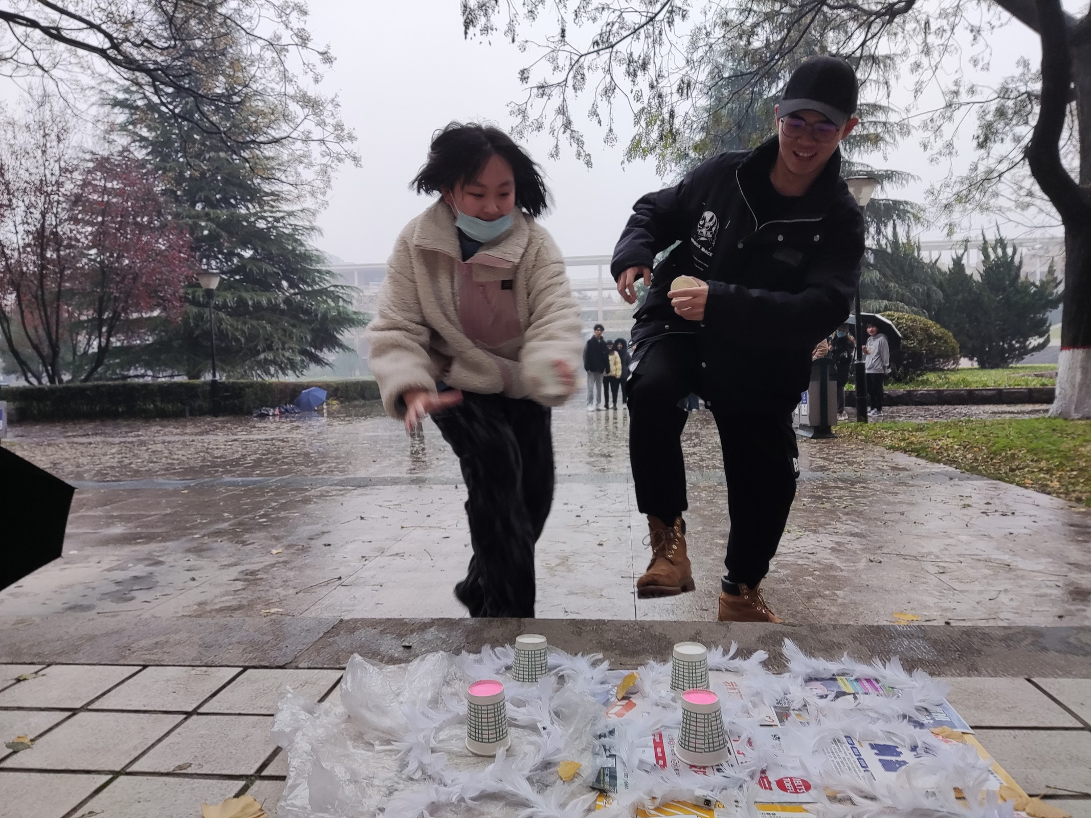 “攻防转换”更是欢乐多多,各队选手分别与工作人员对垒进行石头剪刀布,赢者用气锤敲打对方,败者需要用盾牌进行保护,若攻击方胜利,则记一分,直至十分即可通关。该项目在紧张刺激之余,释放了同学们在日常学习生活中感受到的部分压力,收获了快乐。