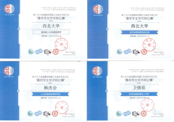 本次会议期间,还举行了第15次全国青年地理工作者学术研讨会及青年员工学术辩论赛,黄晓军老师和苟思远分别作了题为“快速城市化背景下城市边缘区社会脆弱性评价与影响因素分析—以西安市为例”和“基于自媒体平台的“旅游者”时空行为研究—以 W 教授的微信‘朋友圈’为例”的中文报告,引起与会代表的强烈兴趣和热烈讨论,其中黄晓军老师获优秀报告奖。