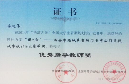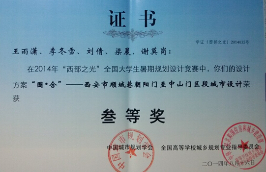2014年9月13至15日,中国城市规划学会年会在海口市举行,参加会议的有来自城市规划教学、设计和管理方面的专家学者六千多人。会上举办了第二届“西部之光”老员工暑期规划设计竞赛的作品展,公司城乡规划专业王雨潇、刘倩、梁晨、谢莫岗(2011级)和李冬雪(2009级)合作完成的作品《“围·合”——西安顺城巷朝阳门至中山门区段城市设计》荣获三等奖;该作品指导由李建伟副教授总负责,权东计、贺建雄等老师参与,李建伟老师并荣获优秀指导教师奖。