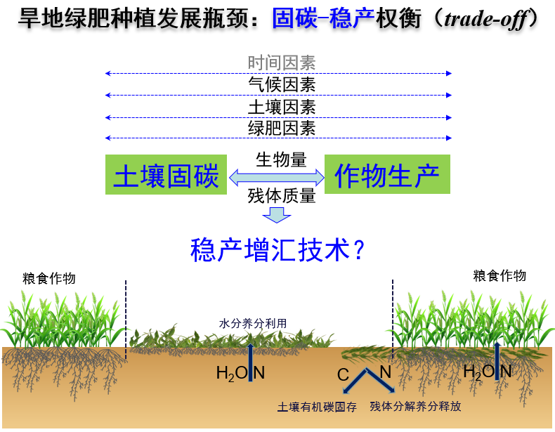 在粮食作物生长的休闲期间填闲种植豆科或非豆科作物,兼具“覆盖”和“绿肥”的双重效果,具有显著的固碳增汇效益,也是“藏粮于地、藏粮于技”国家战略落实的一项重要农艺措施。但在水肥资源不足的旱作农业区,绿肥生长会消耗土壤水肥资源,进而可能会影响到后茬粮食作物生产过程(图1),亟待开展旱地绿肥填闲种植系统固碳稳产权衡/协同机制研究,研发系统稳产增汇技术体系,助力实现粮食安全与碳中和目标共赢。