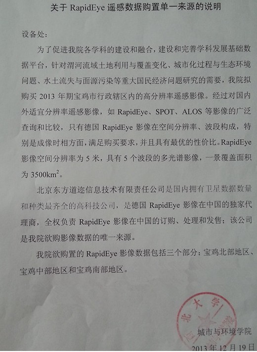 现将英国上市公司365“关于RapidEye遥感数据购置单一来源的说明”公式如下,如有质疑,请于元月20日下午5点之前向资产设备管理处反映,联系电话:88302974。公示期结束后,公司将以单一来源谈判方式采购RapidEye遥感数据。