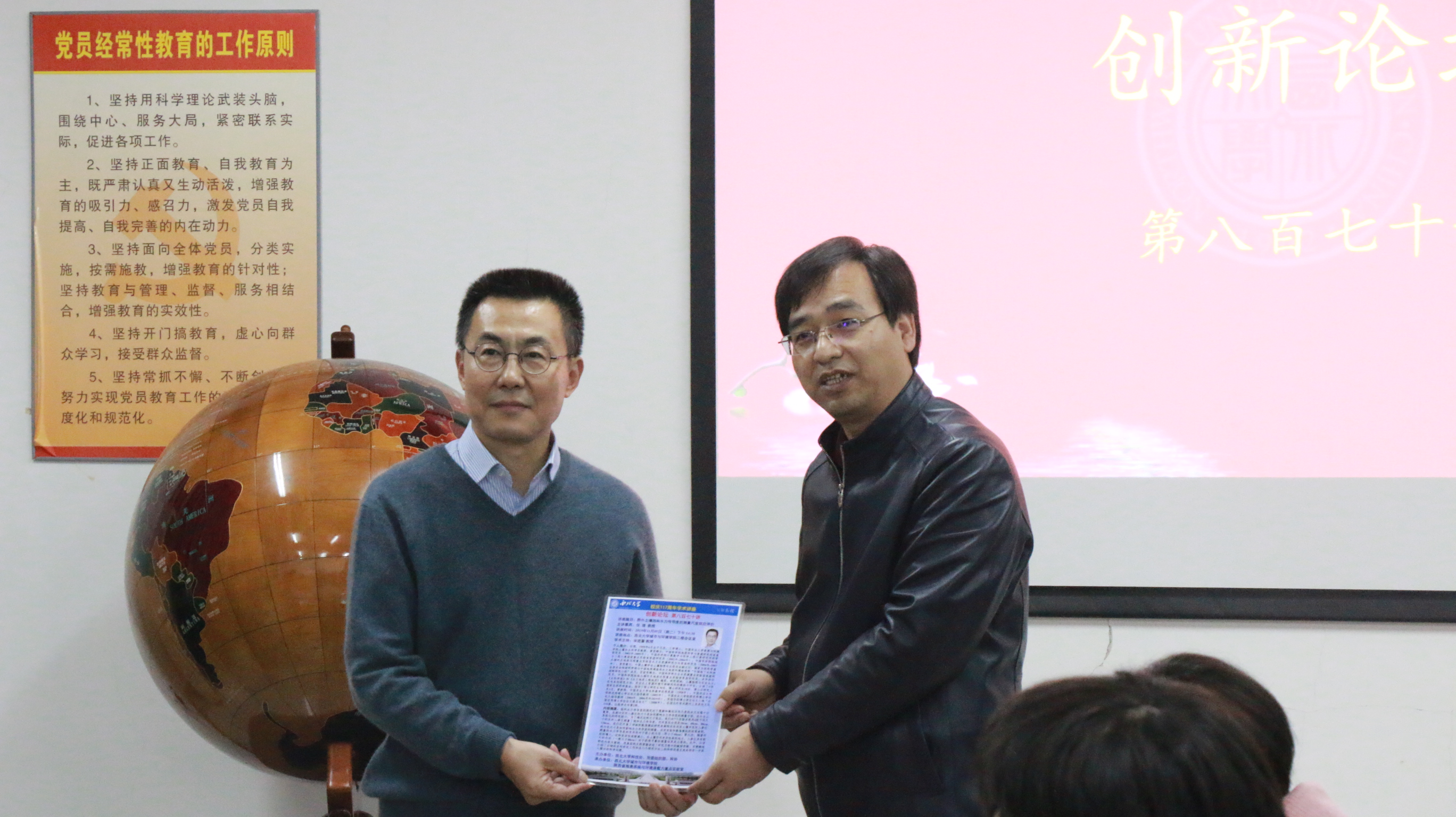 报告会开始前,宋进喜教授向大家详细介绍了任理教授的个人经历。任理教授曾受聘为:中国科公司地理科学与资源研究所客座研究员;中国科公司计算数学与科学工程计算研究所科学与工程计算国家重点实验室客座研究员;中国科公司陆地水循环及地表过程重点实验室水文水资源研究方向客座研究员。任理教授目前受聘与中国科公司农业水资源重点实验室客座研究员;中国科公司陆地水循环及地表过程重点实验室客座研究员。多年担任《水利学报》和《水文地质工程地质》编委。研究领域为土壤物理与农业水文。近年来的研究方向是:农业水土资源环境可持续利用的模拟与评估。主持了5项国家自然科学基金。曾获得:中国农业大公司级优秀博士学位论文指导教师(2004年、2006年和2019年)。指导的博士学位论文入选“全国优秀博士学位论文提名论文”(2008年)。在国内外学术期刊上发表论文近110篇,出版学术专著2部。介绍过后宋进喜教授为任理教授颁发纪念品。