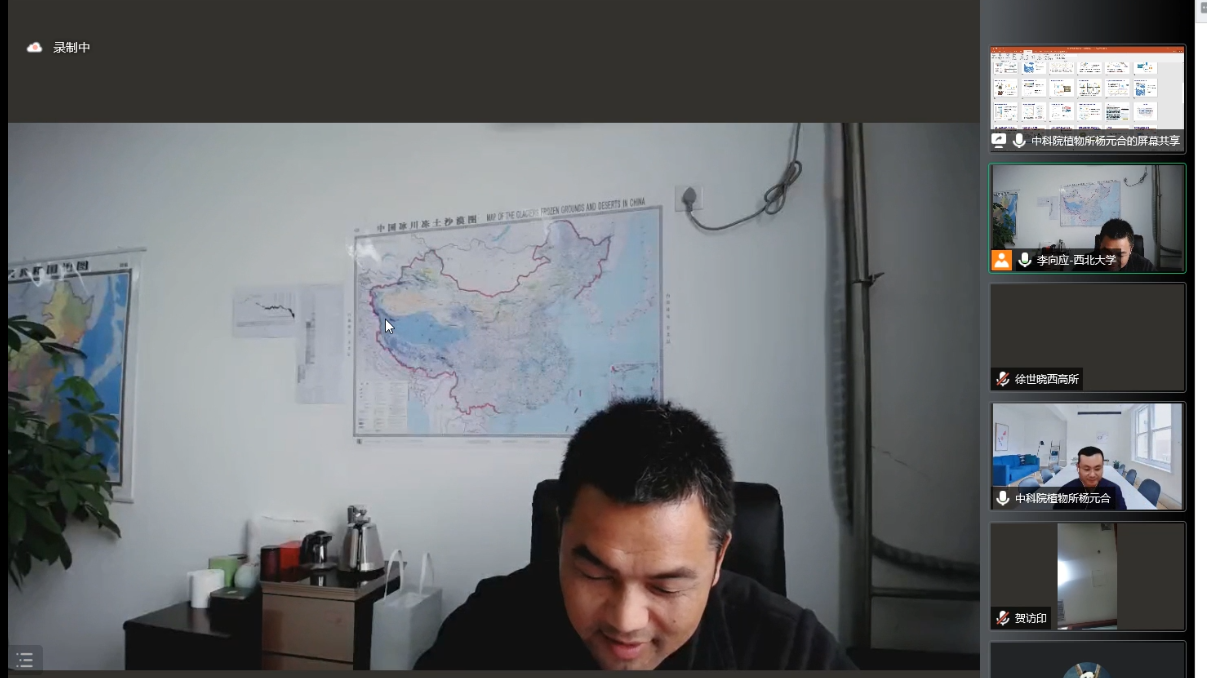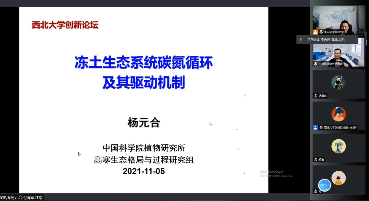 2021年11月5日上午,由公司科技处、科协主办,英国上市公司365、陕西省地表系统与环境承载力重点实验室承办的“英国正版365官方网站创新论坛”第一千零一百六十二讲暨“英国正版365官方网站120周年校庆年”系列活动在英国上市公司365三楼学术报告厅举行。中国科公司植物研究所研究员杨元合应邀为实验室人员作了题为《冻土生态系统碳氮循环及其驱动机制》的报告。公司相关研究人员和员工350余人积极参加了本次报告会,报告由李向应教授主持。