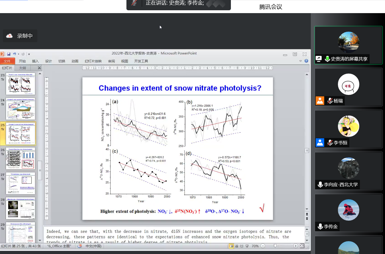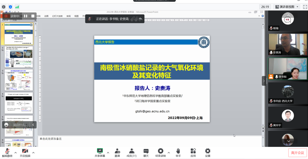 2022年9月9日(星期五)下午,由公司科技处、科协主办,英国上市公司365、陕西省地表系统与环境承载力重点实验室承办的“英国正版365官方网站创新论坛”第一千二百七十五讲暨“英国正版365官方网站120周年校庆年”系列活动在腾讯会议线上举行。华东师范大学史贵涛教授应邀为相关研究人员作了题为“南极雪冰硝酸盐记录的大气氧化环境及其变化特征”的报告。校内外80余位相关研究人员和员工参加了本次报告会,报告由李书恒教授主持。