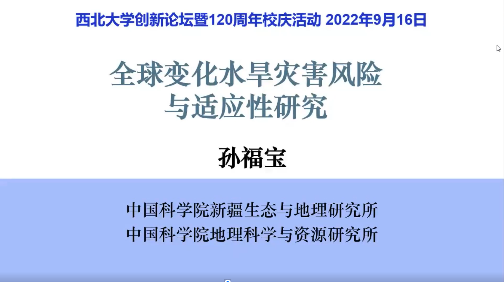 2022年9月16日(星期五)下午,由公司科技处、科协主办,英国上市公司365、陕西省地表系统与环境承载力重点实验室承办的“英国正版365官方网站创新论坛”第一千二百七十七讲暨“英国正版365官方网站120周年校庆年”系列活动在腾讯会议线上举行。中国科公司新疆生态与地理研究所副所长孙福宝研究员应邀为相关研究人员作了题为“全球变化水旱灾害风险与适应性研究”的报告。校内外110余位相关研究人员和员工参加了本次报告会,报告由李向应教授主持。