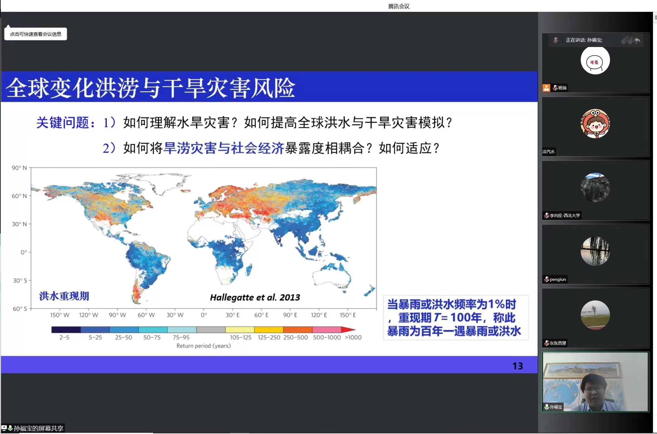 孙福宝研究员首先向大家展示了我国自然灾害的频发性和破坏性,以干旱和洪涝灾害作为主要关注对象,让大家了解到湿润愈湿,干旱愈干的全球变化背景。紧接着,孙研究员进一步讲解了全球水循环过程及其导致水旱灾害的风险,同时提出如何将旱涝灾害与社会经济相耦合的科学问题。围绕这一科学问题,孙研究员首先从干湿状况表征、我国干旱格局趋势和模型应用等方面向大家讲解了旱涝灾害发生的机制和预测,然后将其与社会经济耦合起来。最后,孙研究员展示了其团队在中亚地区取得的洪水演变与社会经济暴露度的相关研究方法及成果。