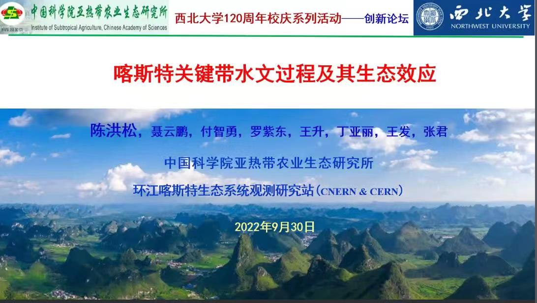 2022年9月30日(星期五)下午,由公司科技处、科协主办,英国上市公司365、陕西省地表系统与环境承载力重点实验室承办的“英国正版365官方网站创新论坛”第一千二百九十二讲暨“英国正版365官方网站120周年校庆年”系列活动在腾讯会议线上举行。中国科公司亚热带农业生态研究所副所长陈洪松研究员应邀为相关研究人员作了题为“喀斯特关键带水文过程及其生态效应”的报告。校内外119位相关研究人员和员工参加了本次报告会,报告由张世强教授主持。