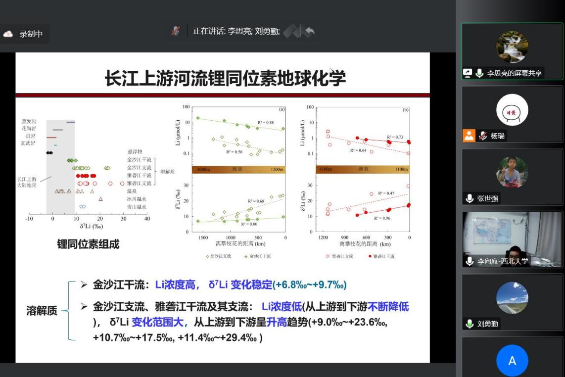 李思亮教授从研究背景出发,首先为大家介绍了河流水化学的发展历程和其动态变化研究的重要性,并展示了长江源区河流水化学特征,为大家对报告内容的理解做了铺垫。接下来李教授以图文形式向大家介绍了长江上游河流不同形态碳的时间变化规律及影响机制,在此部分,李教授特别介绍了碳同位素在其研究中的应用。随后李思亮教授从多个方面展示了其研究团队在长江上游河流锂钙同位素地球化学的相关研究工作。